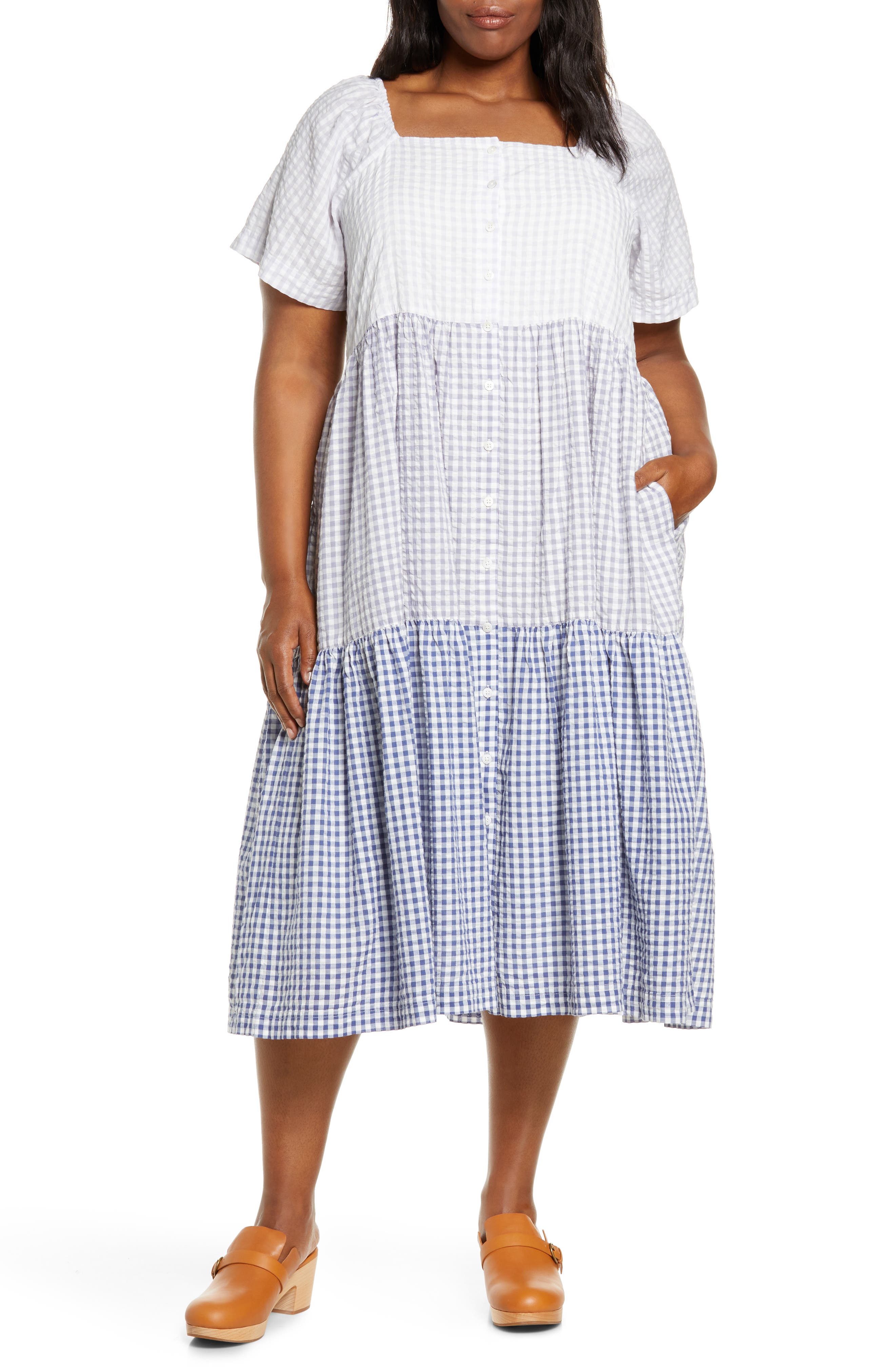 Madewell Patchwork Gingham Button Front Tiered Midi Dress Nordstrom